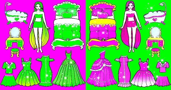 In which dress up look your paper doll will look more good?